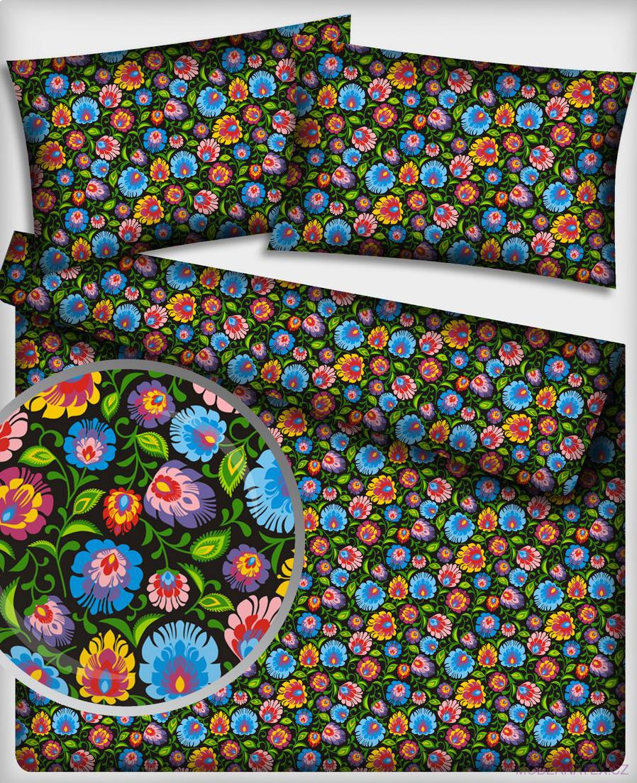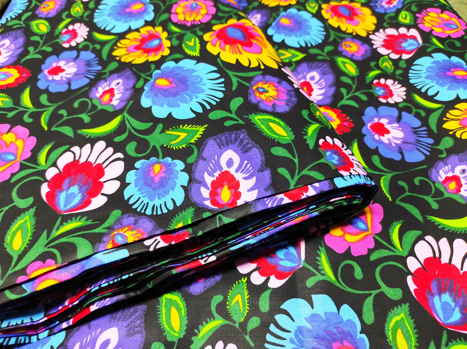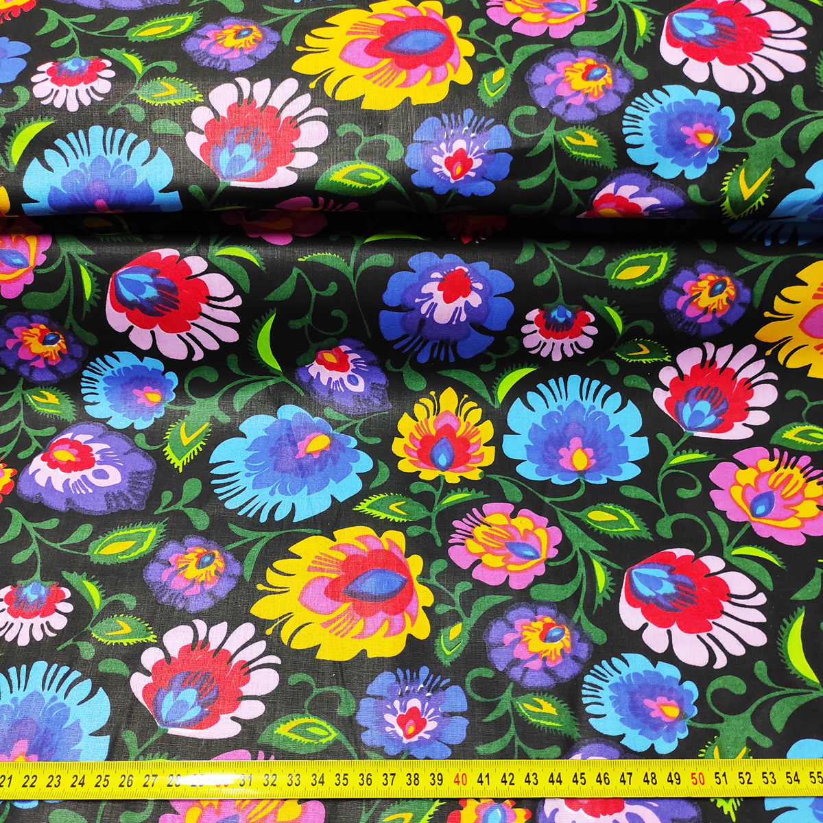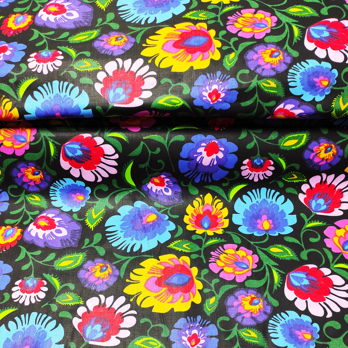 Description Tissu en coton au mètre, 125 g/m², largeur 160 cm, imprimé à fleurs colorées noirs