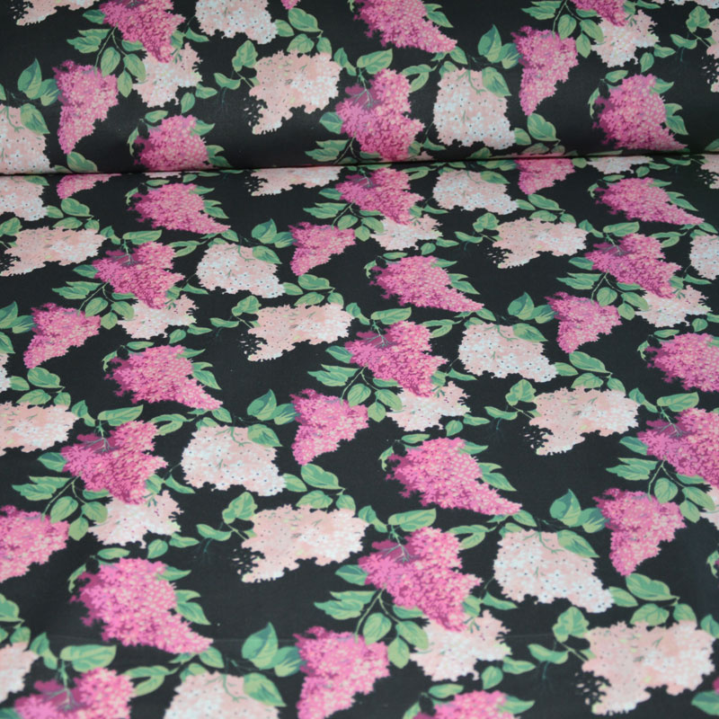 Description Tissu en coton au mètre, 125 g/m², largeur 160 cm, imprimé à lilas rose sur fond noir